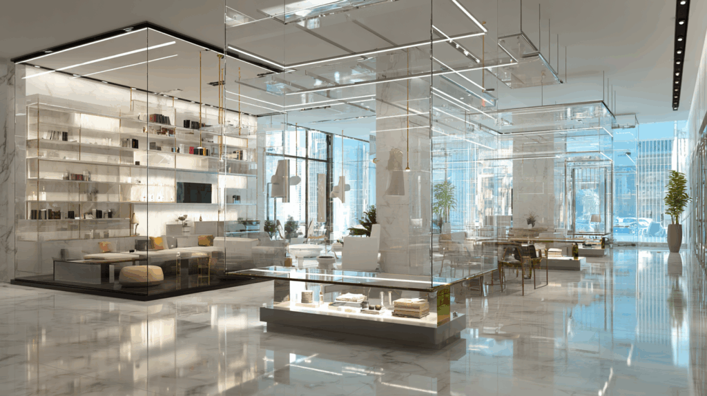 O acrílico transparente oferece um visual clean e contemporâneo, ideal para lojas, escritórios e consultórios. Ele permite que a luz natural passe pelo ambiente, criando sensação de amplitude e destacando produtos ou áreas específicas.